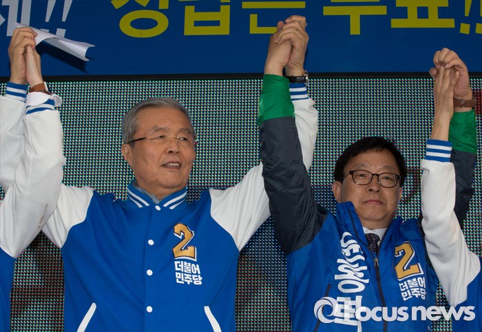 (충주=포커스뉴스) 김종민 더불어민주당 대표가 7일 오후 충북 충주 중앙로에서 윤홍락 후보의 지지를 호소하고 있다.