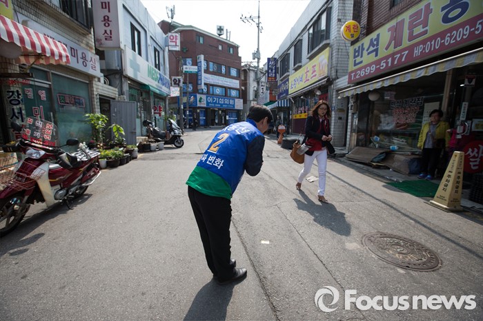 (서울=포커스뉴스) 이용선 더불어민주당 양천구을 후보가 7일 오후 서울 양천구 신월동 신월시장에서 선거운동을 하고 있다.