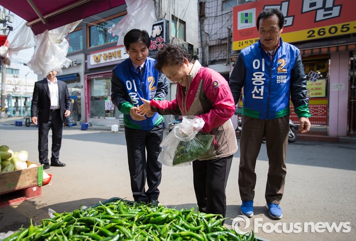 (서울=포커스뉴스) 이용선 더불어민주당 양천구을 후보가 7일 오후 서울 양천구 신월동 신월시장에서 선거운동을 하고 있다.