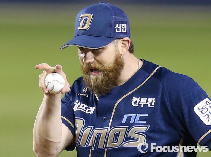 (서울=포커스뉴스) 7일 서울 잠실구장에서 열린 2016 프로야구 NC-두산 경기 2회말 NC 투수 해커가 포수 김태군과 사인을 교환하고 있다.