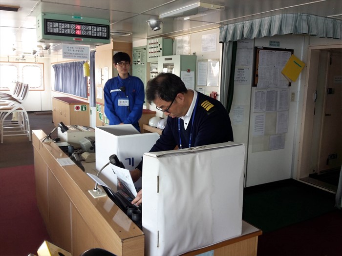 (서울=포커스뉴스) 지난 5일 부산과 일본을 오가는 팬스타 드림호에서 선원들이 선상투표를 하고 있다. <사진제공=부산시 선거관리위원회>