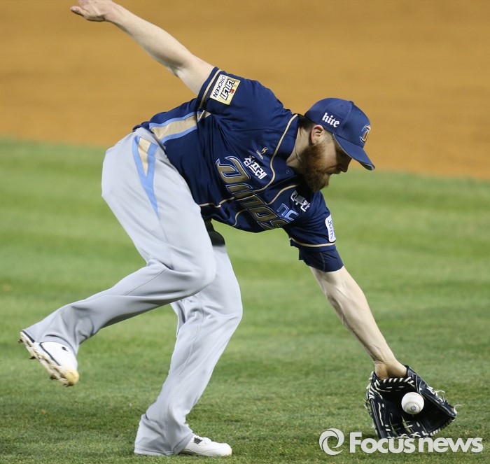 (서울=포커스뉴스) 7일 서울 잠실구장에서 열린 2016 프로야구 NC-두산 경기 4회말 2사 1,3루에서 두산 정수빈의 1루땅볼을 NC 투수 해커가 달려가 잡고 있다.