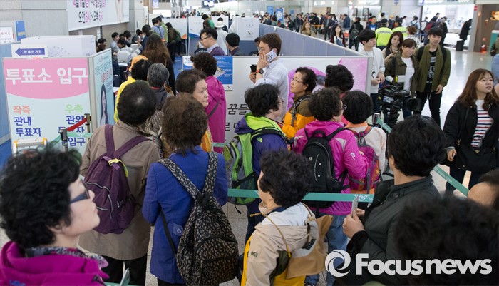 (인천공항=포커스뉴스) 제20대 국회의원 선거 사전투표 시작일인 8일 오전 인천국제공항 출국장에서 유권자들이 사전투표를 하기 위해 줄을 서고 있다.