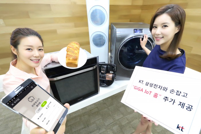 (서울=포커스뉴스) KT는 삼성전자와 함께 8일 가전제품과 연동되는 기가 사물인터넷(IoT) 홈매니저 서비스 4종을 추가하며 IoT 협력을 강화했다.