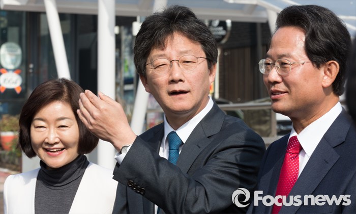 (대구=포커스뉴스) 무소속 유승민(가운데), 권은희(왼쪽), 류성걸 후보가 8일 오전 대구 북구 산격3동 주민센터에 마련된 사전투표소에서 사전투표를 마치고 기자회견을 하고 있다.