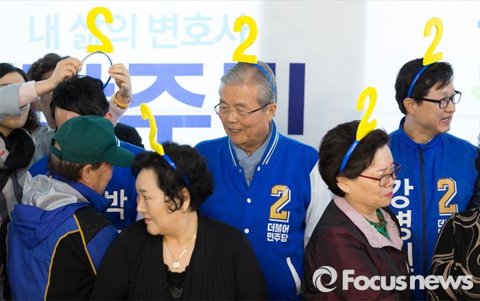 (서울=포커스뉴스) 김종인 더불어민주당 비대위 대표 겸 선대위원장이 8일 오전 서울 은평구 응암로 박주민 은평구갑 후보 사무실에서 중앙선거대책위원회 회의 전 2번이 적힌 머리띠를 착용하고 지역 어르신들과 기초노령연금인상 공약 퍼포먼스를 하고 있다.