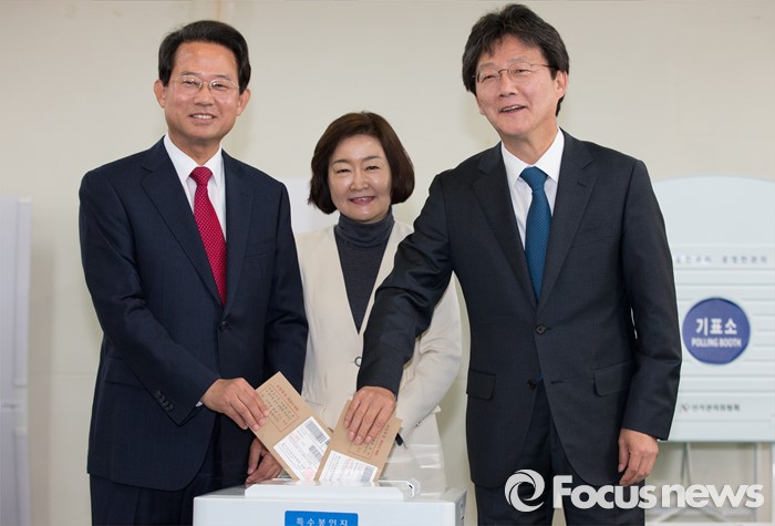 (대구=포커스뉴스) 무소속 유승민(대구 동을, 오른쪽부터), 권은희(대구 북갑), 류성걸(대구 동갑) 후보가 8일 오전 대구 북구 산격3동 주민센터에 마련된 사전투표소에서 사전투표를 하고 있다.