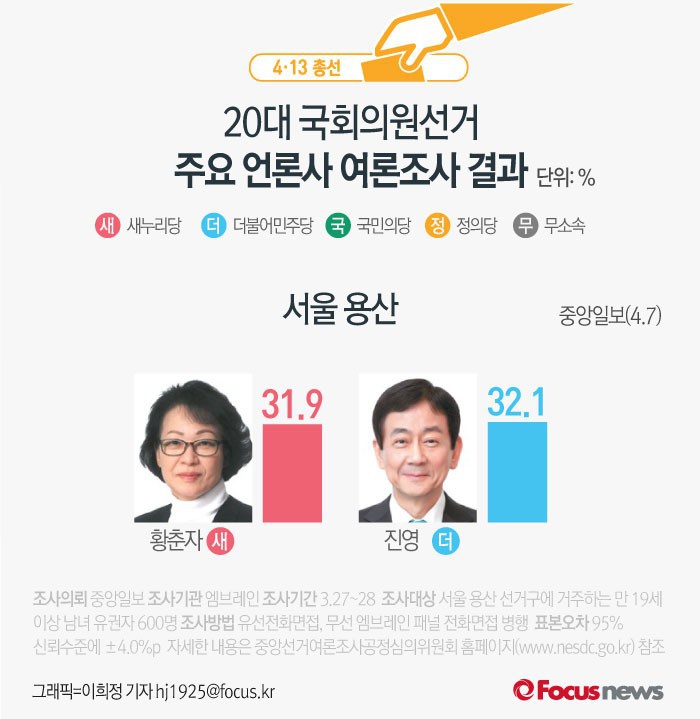 (서울=포커스뉴스) 4·13 총선을 5일 남겨둔 가운데 서울 용산에 출마한 황춘자 새누리당 후보가 진영 더불어민주당 후보에 오차범위 안에서 우세한 것으로 나타났다.