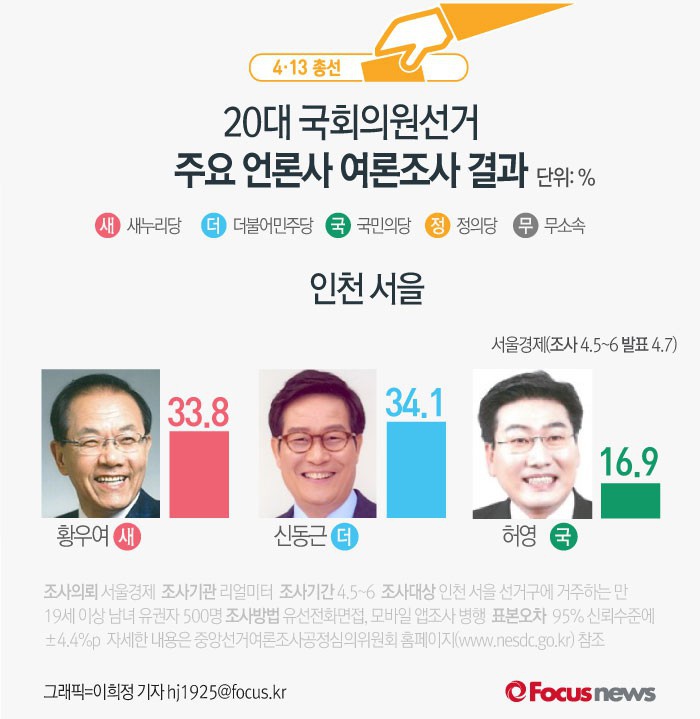 (서울=포커스뉴스) 서울경제가 리얼미터에 의뢰해 5~6일 실시한 인천 서을 여론조사 결과에 따르면 새누리당 황우여 후보의 지지율은 33.8%, 더불어민주당 신동근 후보의 지지율은 34.1%, 국민의당 허영 후보는 16.9%로 나타났다.