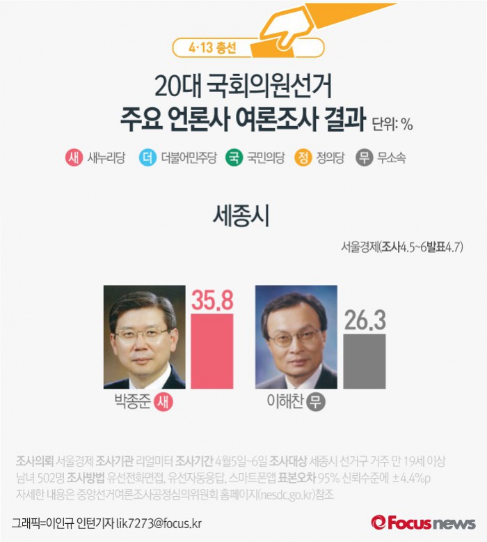 (서울=포커스뉴스) 서울경제가 여론조사기관 리얼미터에 의뢰해 7일 발표한 결과에 따르면 세종시에서 새누리당 박종준 후보의 지지율은 35.8%, 무소속 이해찬 후보의 지지율은 26.3%인 것으로 나타났다.