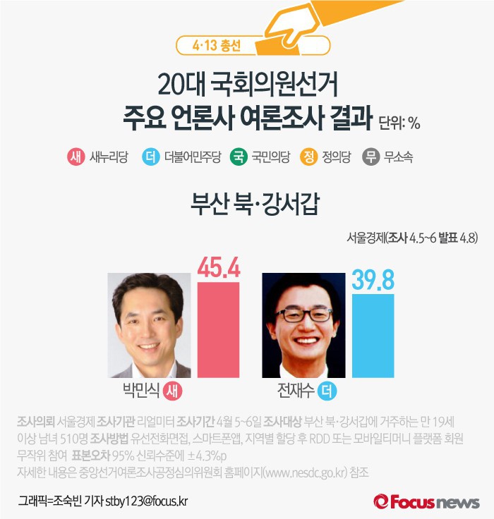 앞서 SBS가 여론조사기관 TNS에 의뢰해 6일 발표한 결과에서 전재수 후보는 지지율 45.6%를 기록, 박민식 후보(41.1%)보다 4.5%p 높았다.