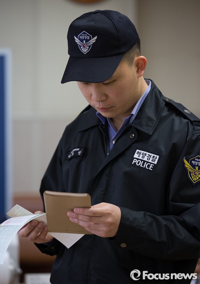 (인천=포커스뉴스) 제20대 국회의원 선거 사전투표 시작일인 8일 오전 인천 연수구 송도1동 주민센터에서 인천 중부해양경비안전본부 소속 해경이 투표 전 투표용지를 보고 있다.