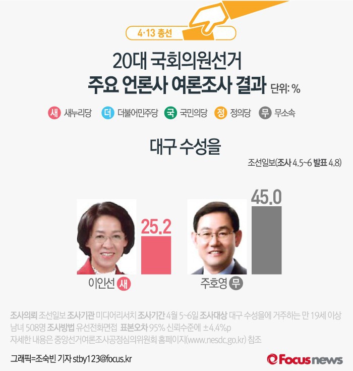 (서울=포커스뉴스) 조선일보가 여론조사기관 미디어리서치에 의뢰해 8일 발표한 결과에 따르면 대구 수성을에서 새누리당 이인선 후보의 지지율은 25.2%, 무소속 주호영 후보의 지지율은 45.0%인 것으로 나타났다.