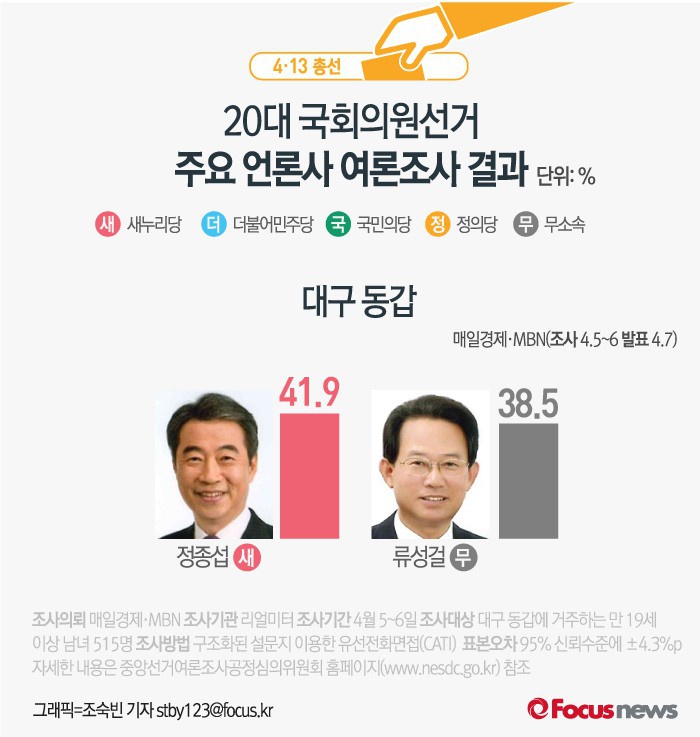 (서울=포커스뉴스) 매일경제와 MBN이 여론조사기관 리얼미터에 의뢰해 7일 발표한 결과에 따르면 대구 동갑에서 새누리당 정종섭 후보의 지지율은 41.9%, 무소속 류성걸 후보의 지지율은 38.5%인 것으로 나타났다.