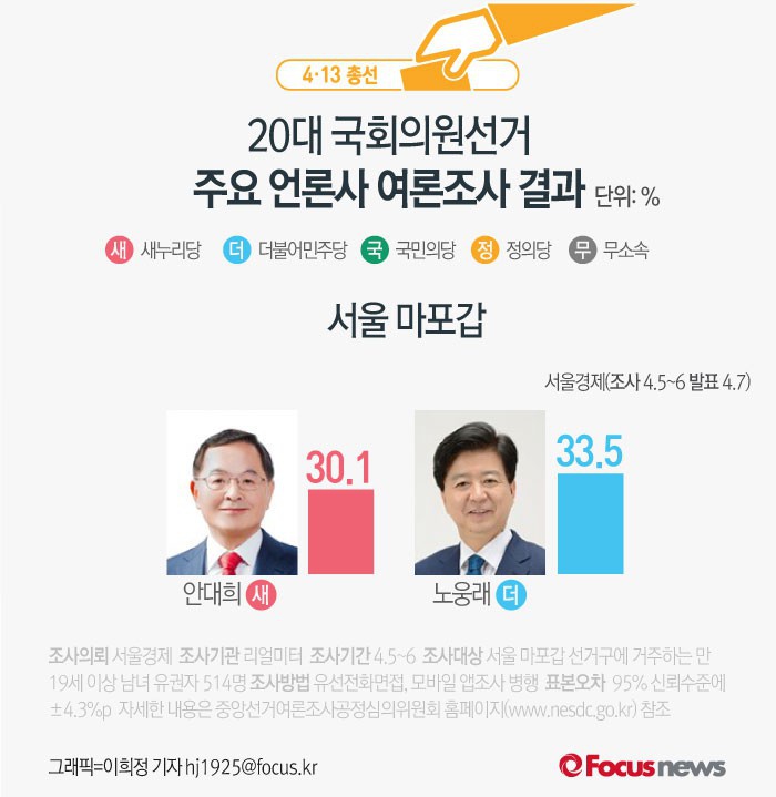 이번 서울경제 여론조사는 5~6일 서울 마포갑 선거구 거주 만 19세 이상 남녀 514명을 대상으로 해 유선ARS·유선전화면접·스마트폰앱 조사 방식으로 진행됐다. 표본오차는 95% 신뢰수준에 ±4.3%p다.