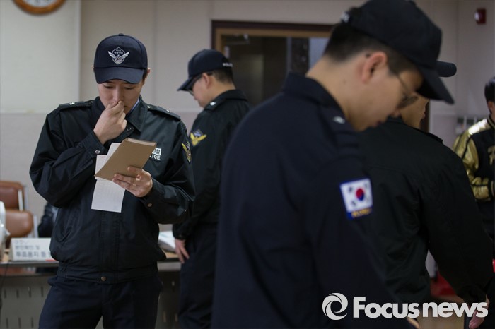(인천=포커스뉴스) 제20대 국회의원 선거 사전투표 시작일인 8일 오전 인천 연수구 송도1동 주민센터에서 인천 중부해양경비안전본부 소속 의경이 투표 전 투표용지를 살펴보고 있다.