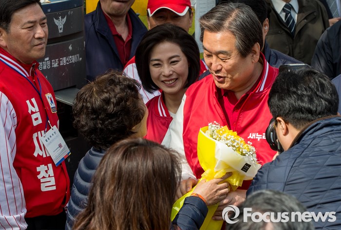 (안양=포커스뉴스) 8일 오전 경기 안양시 범계역 인근에서 심재철 새누리당 안양동을 후보 지원유세에 나선 김무성 대표가 한 지지자에게 꽃다발을 받고 있다.