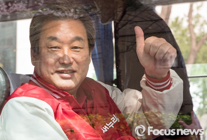 (안양=포커스뉴스) 8일 오전 경기 안양시 범계역 인근에서 심재철 새누리당 안양동을 후보 지원유세에 나선 김무성 대표가 유세를 마친 후 버스 안에서 포즈를 취하고 있다.