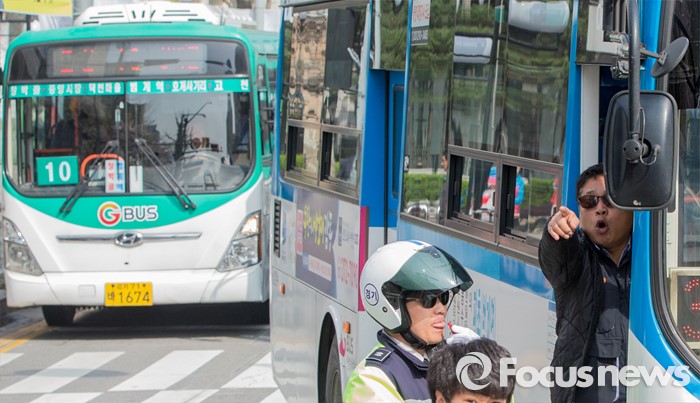 (안양=포커스뉴스) 8일 오전 경기 안양시 범계역 인근에서 열린 심재철 새누리당 안양동을 후보 지원유세현장 옆을 버스 운전자가 경찰에게 불편을 토로하고 있다.