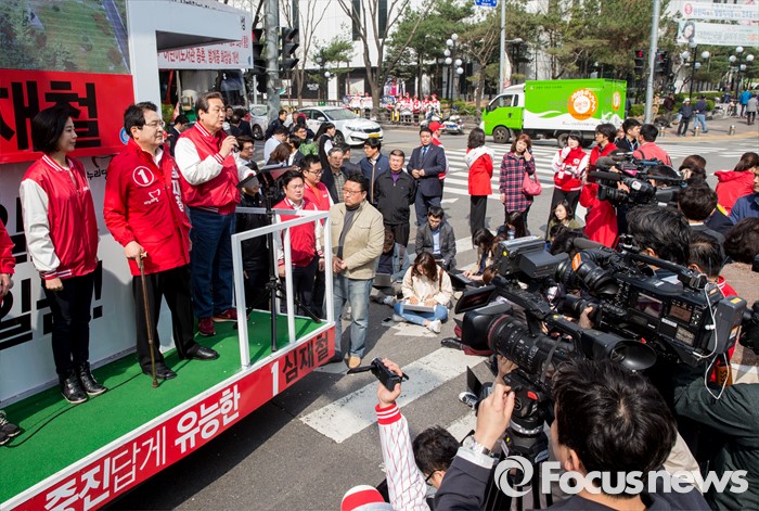 (안양=포커스뉴스) 8일 오전 경기 안양시 범계역 인근에서 심재철 새누리당 안양동을 후보 지원유세에 나선 김무성 대표가 유권자들의 지지를 호소하고 있다.