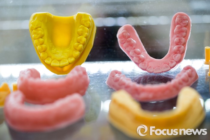 현재 국내에서는 광대뼈나 두개골 결손부위에 사용하는 치료 목적의 체내 이식형 의료기기는 메디쎄이 등 2개사 9개 제품이, 임플란트 등 수술 부위를 표시‧안내하기 위해 사용하는 수술용 가이드는 셀루메드 등 4개사 5개 제품이 허가돼 있다.(서울=포커스뉴스)4일 서울 삼성동 코엑스에서 개막한 '2015 3D프린팅코리아'에서 3D 프린터로 만든 치아틀. 3D 프린팅은 다양한 현대의학 분야에도 적용되고 있다.2015.11.05 김흥구 기자