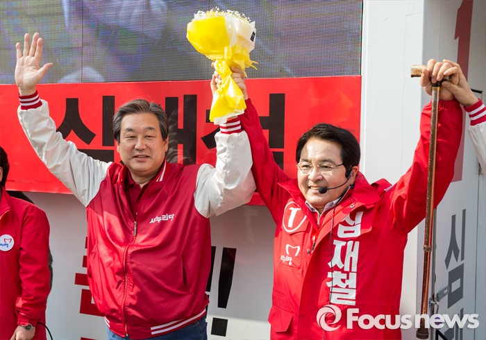 (안양=포커스뉴스) 8일 오전 경기 안양시 범계역 인근에서 심재철 새누리당 안양동을 후보 지원유세에 나선 김무성 대표가 유권자들의 지지를 호소하고 있다.