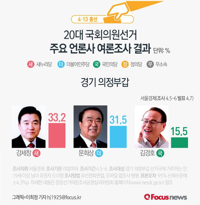 강세창 후보와 문희상 후보는 각각 지지율 33.2%와 31.5%를 기록했다. 김경호 후보는 15.5%다.