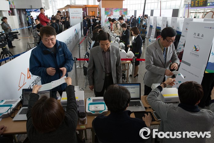 (서울=포커스뉴스) 4.13총선 사전투표 첫째날인 8일 오전 서울 용산구 서울역에 설치된 남영동 사전투표소에서 시민들이 투표를 하고 있다. 사전투표는 4.8~4.9일까지 진행된다.