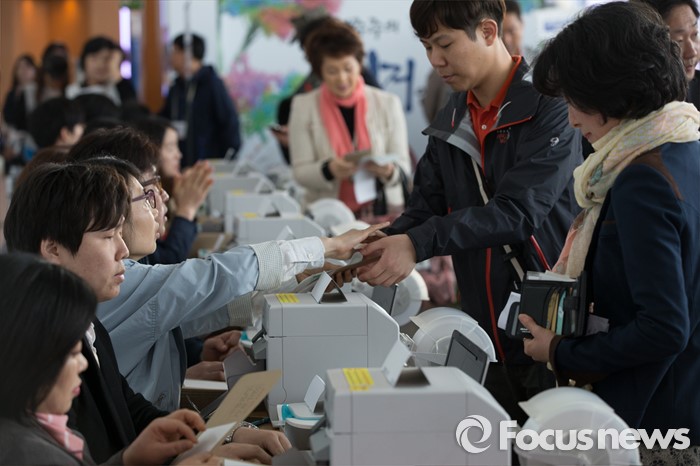 (서울=포커스뉴스) 4.13총선 사전투표 첫째날인 8일 오전 서울 용산구 서울역에 설치된 남영동 사전투표소에서 시민들이 투표를 하고 있다. 사전투표는 4.8~4.9일까지 진행된다.