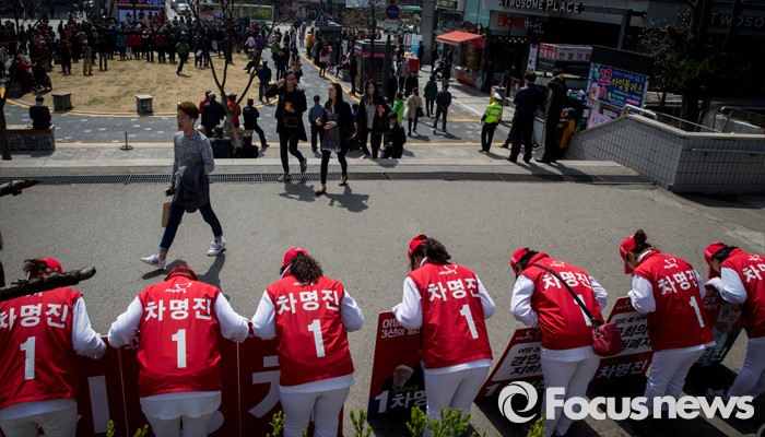 (부천=포커스뉴스) 8일 오전 경기 부천시 역곡역 인근에서 열린 차명진 새누리당 부천소사구 후보 지원유세에서 차 후보의 선거사무원이 시민들에게 허리 숙여 인사하고 있다.