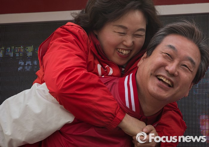 (부천=포커스뉴스) 8일 오전 경기 부천시 역곡역 인근에서 차명진 새누리당 부천소사구 후보 지원유세에서 나선 김무성 대표가 이음재 부천원미갑 후보를 업어주고 있다.