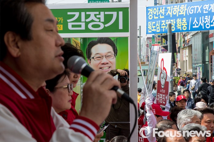 (부천=포커스뉴스) 8일 오전 경기 부천시 역곡역 인근에서 열린 차명진 새누리당 부천소사구 후보 지원유세에서 차 후보 유세차량 옆에 김정기 국민의당 후보 차량이 함께 주차돼 있다.