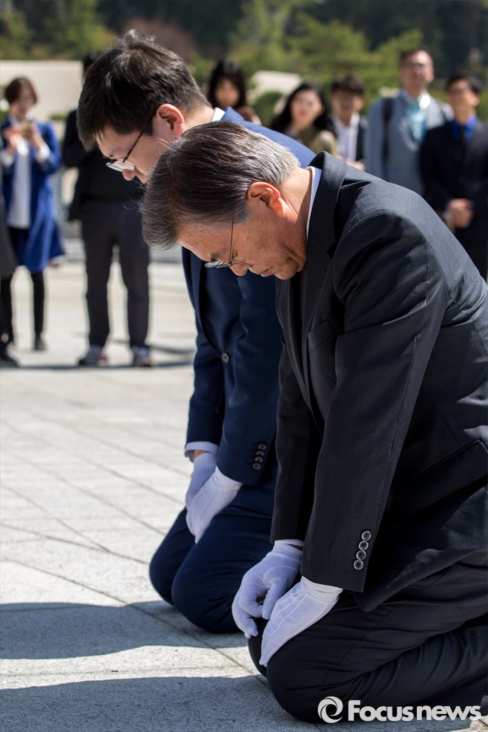 (광주=포커스뉴스) 문재인 더불어민주당 전 대표와 김홍걸 국민통합위원장이 8일 오전 전남 광주 5.18 민주항쟁 추모탑을 찾아 무릎을 꿇고 참배 하고 있다.