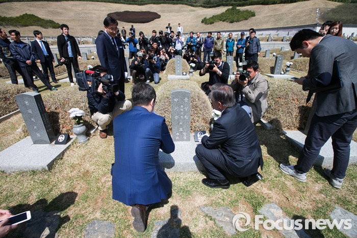 더불어민주당 문재인 전 대표(왼쪽 두번째)가김홍걸 국민통합위원장과 함께 8일 오전 광주 5.18민주묘지를 방문해 열사들의 묘소를 참배하고 있다.
