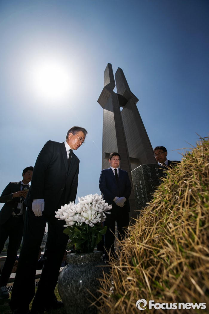 (광주=포커스뉴스) 문재인 더불어민주당 전 대표(왼쪽)가김홍걸 국민통합위원장과 함께 8일 오전 광주 5.18민주묘지를 방문해 열사들의 묘소를 참배하고 있다.