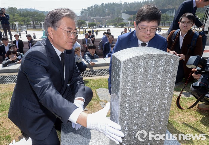 (광주=포커스뉴스) 8일 오전 광주 국립 518묘지를 찾은 더불어민주당 문재인(왼쪽) 전 대표와 김홍걸 국민통합위원장이 윤상원 열사 묘역을 참배하고 있다.