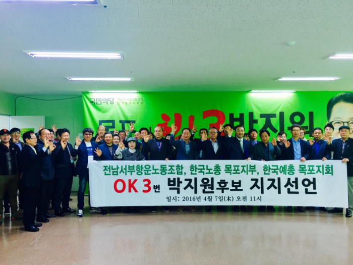 전남서부항운노동조합(이영춘 위원장)은 "박지원 후보가 목포의 항만 시설 확충에 많은 예산을 확보해 왔음을 높이 평가하며, 박지원 후보의 공약인 '명품항구 도시건설'로 목포항만 시설이 확충되고 화물물동량 유치와 목포항 발전에 기여할 수 있을 것이기에 지지 한다”고 강조했다.