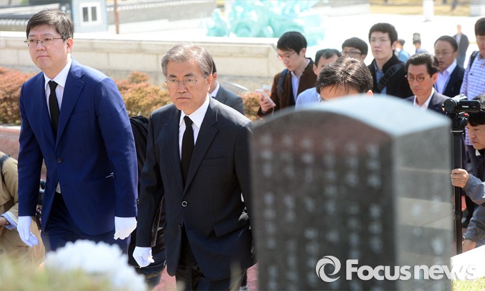 (광주=포커스뉴스) 8일 오전 광주 국립 518묘지를 찾은 더불어민주당 문재인(오른쪽) 전 대표와 김홍걸 국민통합위원장이 묘역을 참배하기 위해 들어서고 있다.