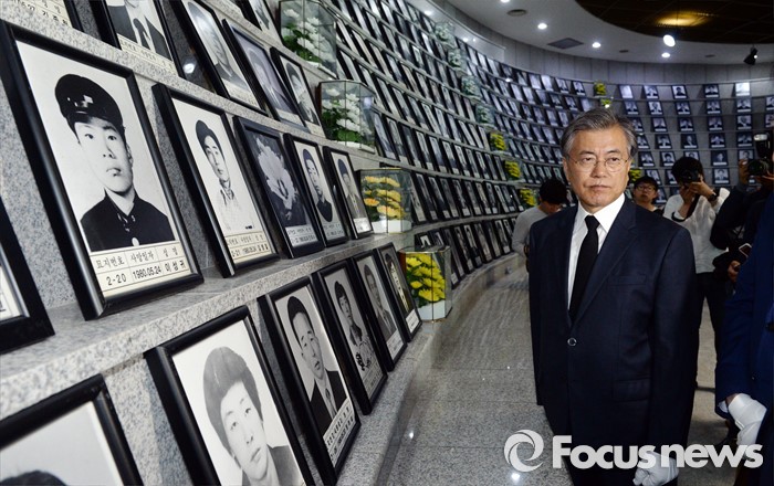 (광주=포커스뉴스) 8일 오전 광주 국립 518묘지를 찾은 문재인 전 더불어민주당 대표가 유영봉안소에서 추모하고 있다.