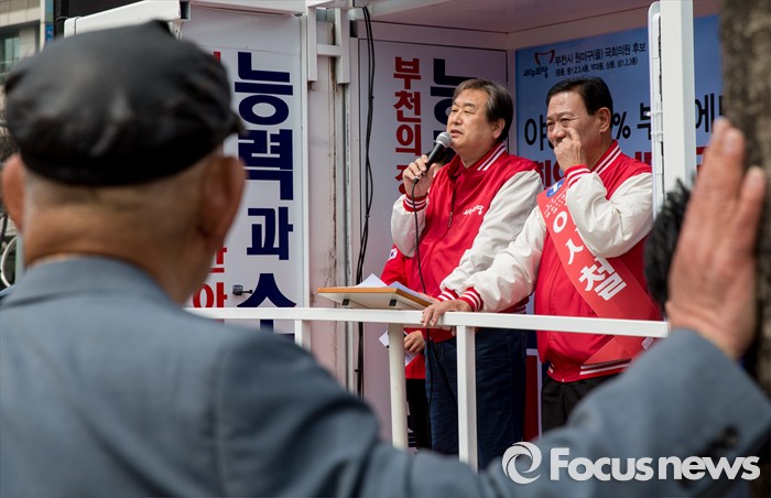 (부천=포커스뉴스) 8일 오후 경기 부천시 역곡역 인근에서 이사철 새누리당 부천원미을 후보 지원유세에 나선 김무성 대표가 유권자들의 지지를 호소하고 있다.