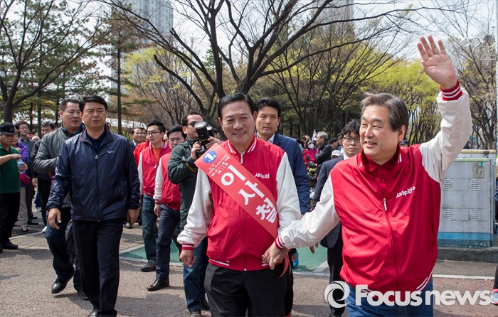 (부천=포커스뉴스) 8일 오후 경기 부천시 역곡역 인근에서 이사철 새누리당 부천원미을 후보 지원유세에 나선 김무성 대표가 유권자들의 지지를 호소하고 있다.