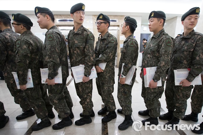 (서울=포커스뉴스) 4.13총선 사전투표 첫째날인 8일 오후 서울 서초구 방배4동 주민센터에 설치된 사전투표소에서 수방사 장병들이 투표를 하기위해 기다리고 있다.
