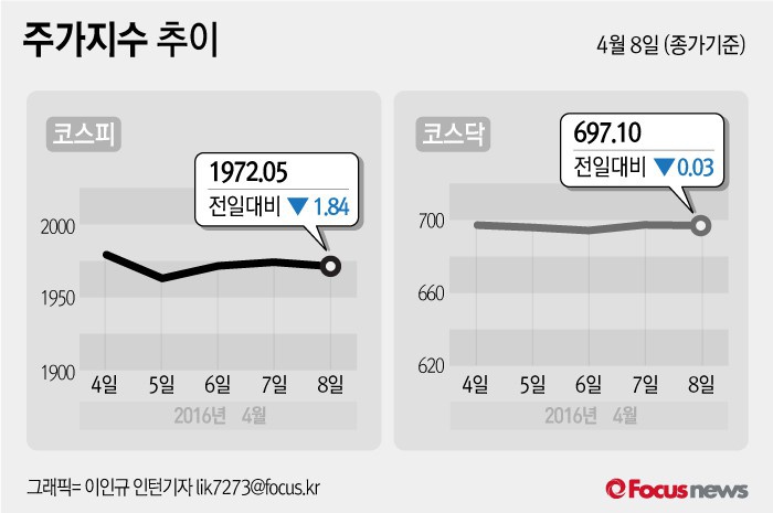 (서울=포커스뉴스) 8일 코스피지수는 전날 보다 0.09%(1.84포인트) 내린 1972.05에 장을 마쳤다. 코스닥지수는 전일 대비 0.00%(0.03포인트) 내린 697.10에 마감했다.