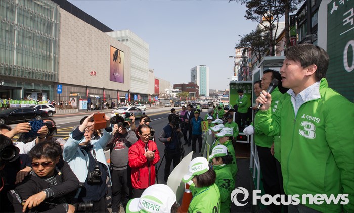 (천안=포커스뉴스) 안철수 국민의당 대표가 8일 오후 충남 천안 신부동 신세계백화점 앞에서 천안에 출마한 후보의 지지를 호소하고 있다.
