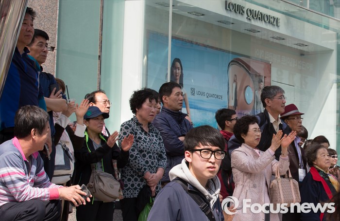 (천안=포커스뉴스) 8일 오후 충남 천안 신부동 신세계백화점 앞에서 시민들이 안철수 국민의당 대표의 지지를 호소를 바라보고 있다.