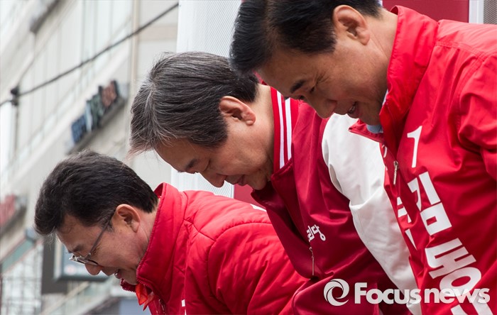(김포=포커스뉴스) 8일 오후 경기 김포시 사우동 인근에서 김동식 새누리당 김포갑, 홍철호 김포을 후보 합동지원유세에 나선 김무성 대표가 두 후보와 함께 인사하고 있다.