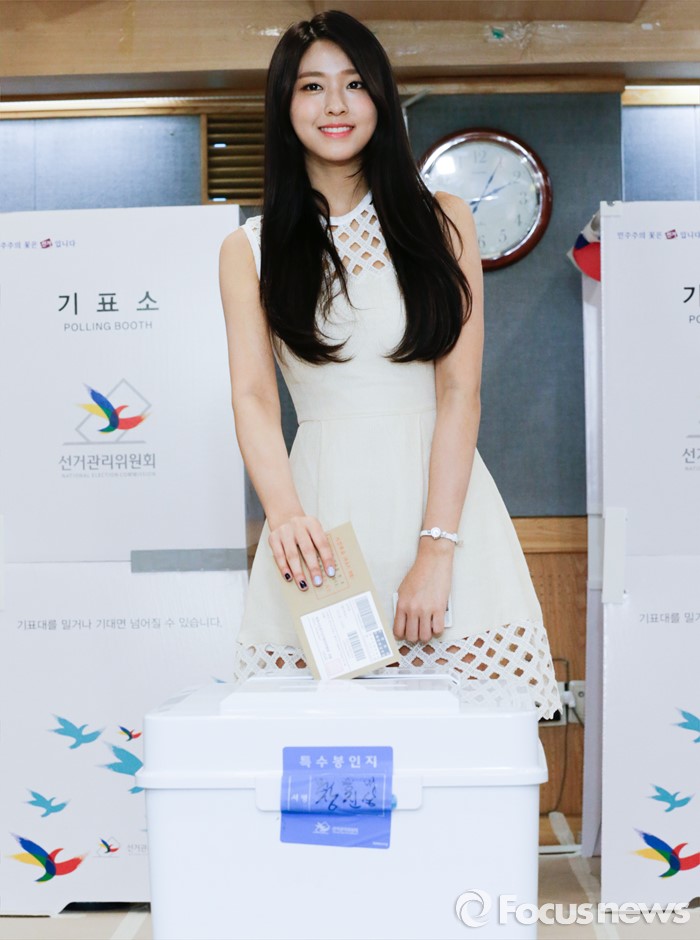 (서울=포커스뉴스) 20대 총선을 닷새 앞두고 사전투표가 이틀동안 실시되는 8일 오후 서울 강남구 청담동주민센터에 마련된 사전투표소에서 총선 홍보대사인 그룹 AOA의 설현이 투표를 하고 있다.