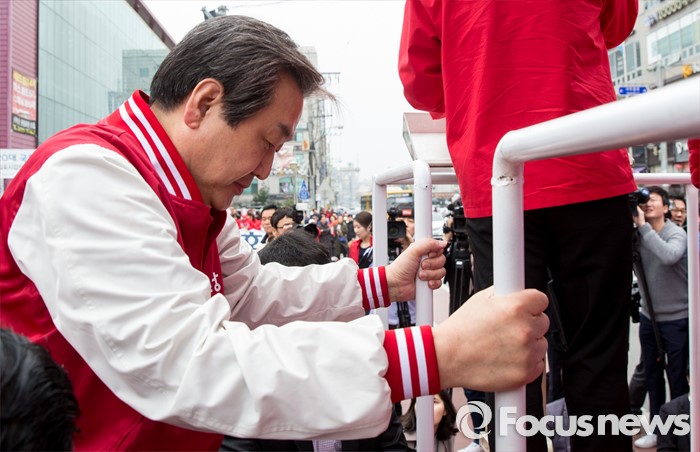 (김포=포커스뉴스) 8일 오후 경기 김포시 사우동 인근에서 김동식 새누리당 김포갑, 홍철호 김포을 후보 합동지원유세에 나선 김무성 대표가 유세차량에 오르고 있다.