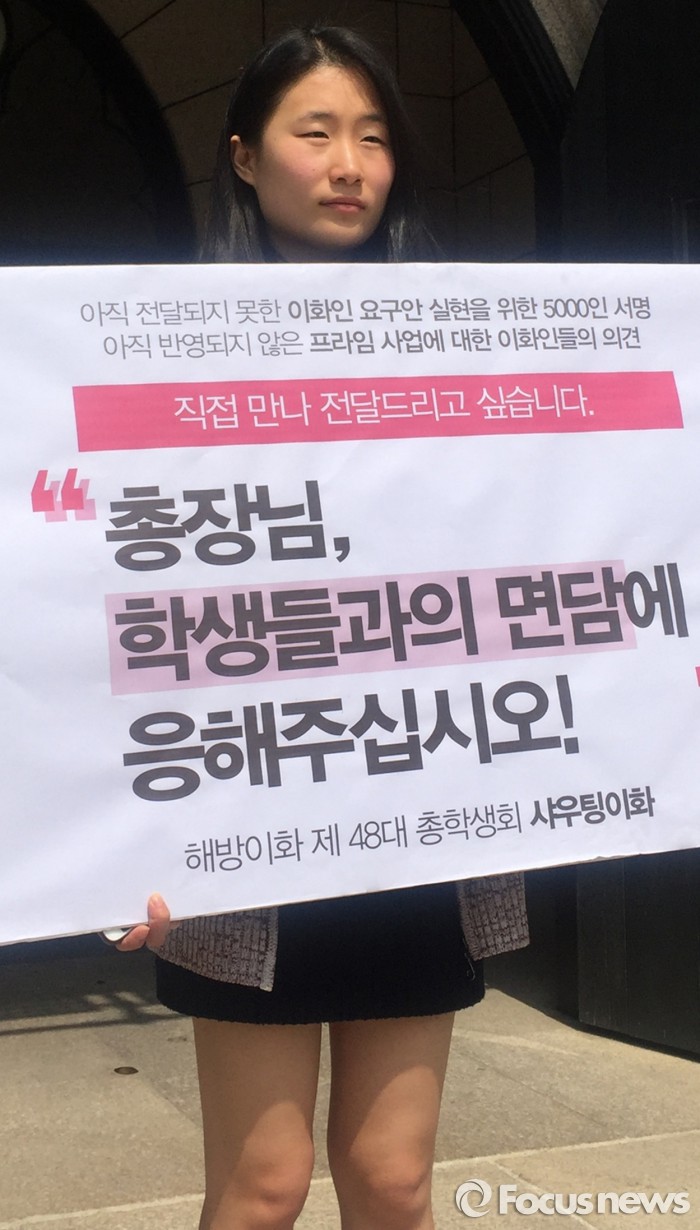 총학생회는 총장 면담을 위한 피켓시위를 이어가고 프라임사업 선정을 추진하는 교육부에도 학생들의 뜻을 모은 '항의서한'을 전달할 예정이다.8일 서울 서대문구에 위치한 이화여자대학교 본관 앞에서 최은혜 총학생회 회장이 피켓시위를 하고 있다. 박지선 기자 지난 5일 이화여대 정문 앞에 놓여진 근조화환들. '프라임사업 반대', '이화의 명복을 빕니다' 등 문구가 적혀 있다. <사진제공=이화여대 총학생회>