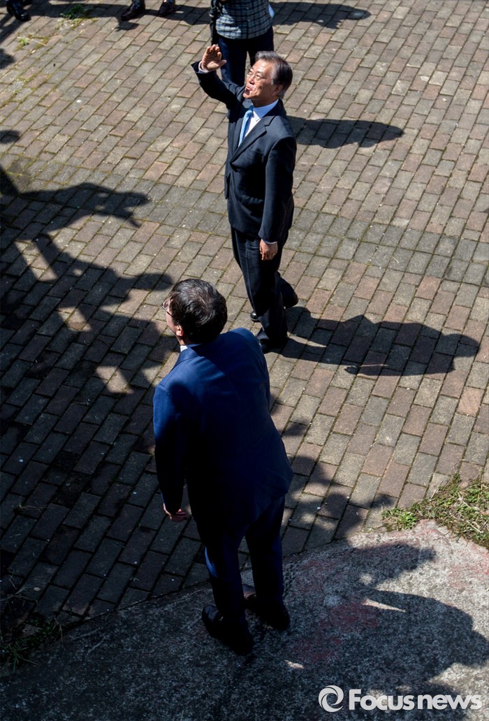 (광주=포커스뉴스) 문재인 더불어민주당 전 대표와 김홍걸 국민통합위원장이 8일 오후 광주시 서구 광주천일대를 거닐며 지역주민들과 인사 하고 있다.